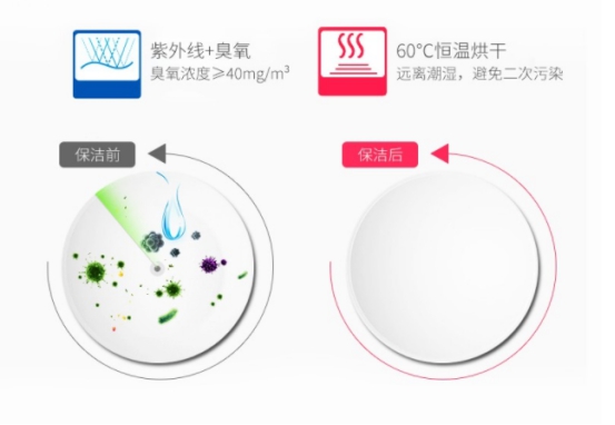 一星級消毒標準:能殺死大腸桿菌等具有代表性的菌種。臭氧消毒時,消毒柜內臭氧濃度應大于等于每立方米20毫克,消毒時間30分鐘左右。高溫消毒時,消毒柜內消毒溫度應大于等于100攝氏度,消毒時間15分鐘左右。