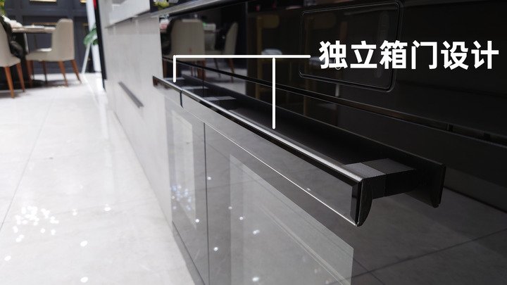 金屬材質(zhì)的蒸、烤箱門把手,久經(jīng)使用也不易變形松動(dòng),表面另嵌入了黑晶玻璃提升質(zhì)感。