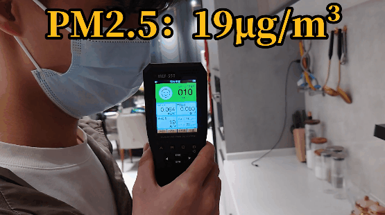 使用空氣檢測(cè)儀測(cè)試鼻子附近的空氣質(zhì)量,可見人臉處基本沒(méi)有受到濃煙污染,下方油鍋則污染嚴(yán)重,證明煙霧完全被控制在攏煙區(qū)域內(nèi)。